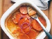 - Place a layer of Potato on the bottom of a pyrex dish, slightly overlapping. (Dish should be about 21cm x 13cm x 7cm)